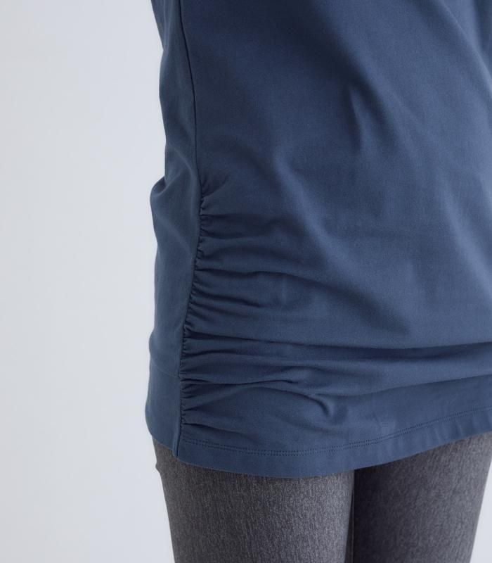 フロント裾にあるアシンメトリーなギャザーが気になるお腹周りもお洒落にカバー。